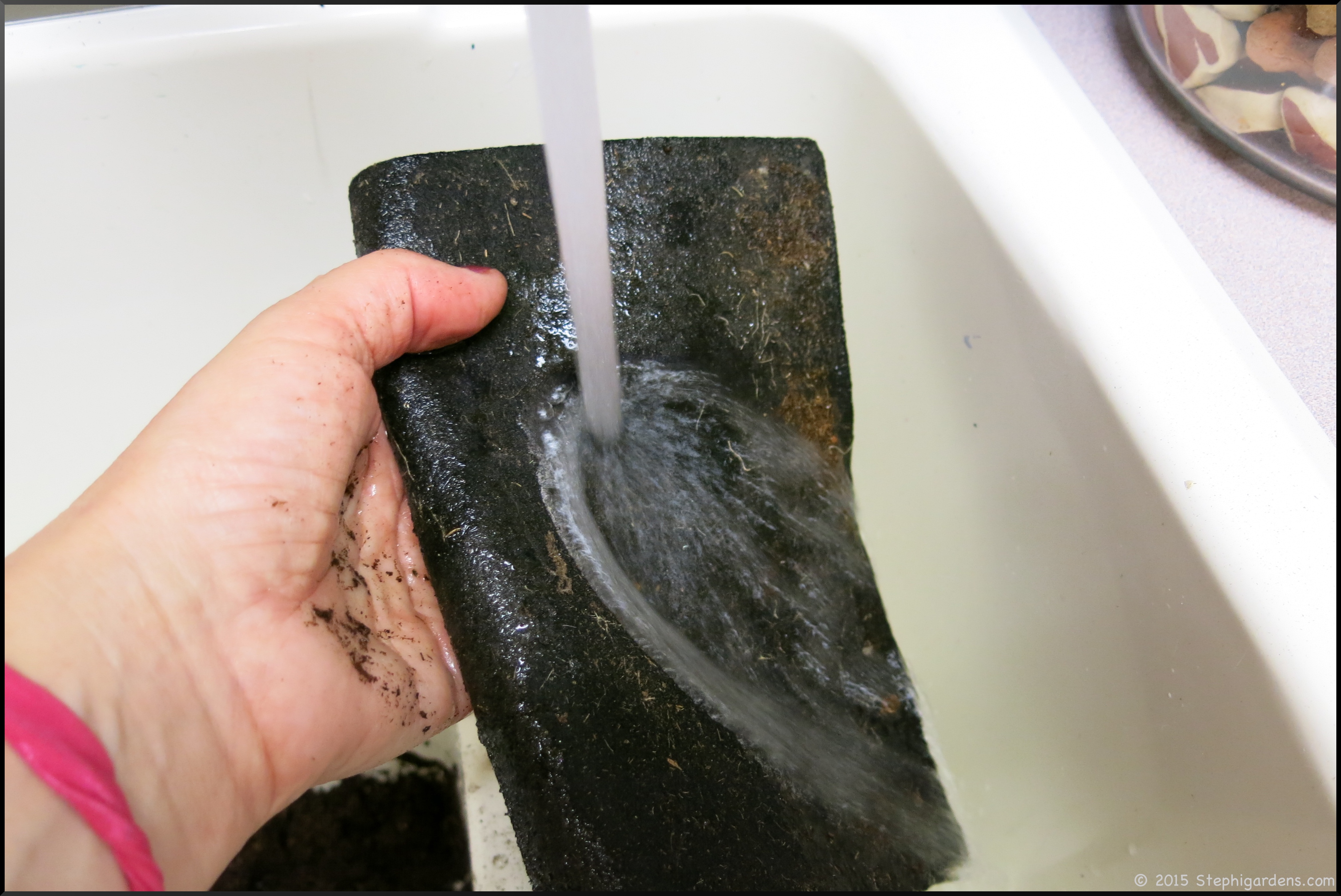 What I ended up doing while I was away was to place the paper pots in a baking pan and fill the tray up with water. The plants just soaked up what they needed. I did figure out I needed to fill the tray the day before, and again right before leaving since the soil soaked up so much water right away. That has seemed to work well for 4-5 day trips. I don’t keep them this damp too long so I don’t encourage mold/fungus to grow that could damage the seedlings. (What’s my favorite indoor watering can? The Oxo 3 liter Indoor Pour and Store)