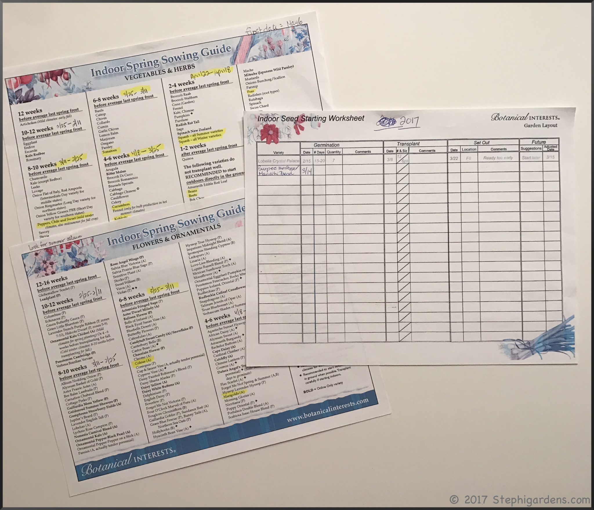 I usually add a couple of weeks to the last frost date to be on the safe side, so I’m aiming to plant the week after Mother’s Day. I keep track of what I’m doing on these handy Botanical Interests Month-to Month planner sheets.