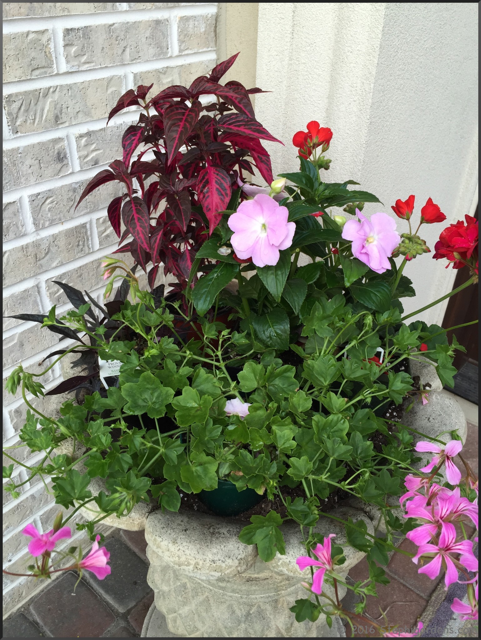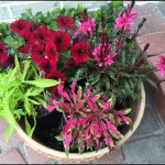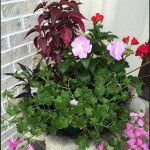 Each year I head to the local garden store to pick out flowers for the planters. The results are rarely the same from year to year since I just pick what I like at that moment. Sometimes I might like yellows, other times maybe purples, sometimes more upright, others lots of vines. This year for the front stoop I was in apparently in a pink/purple mood.