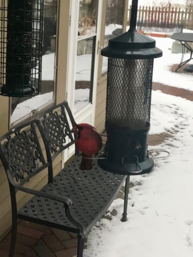 Most years it’s been the Northern Cardinal, a favorite at my feeders. I have this Squirrel Buster Standard Squirrel-proof Bird Feeder from Brome with perches perfect for cardinals right outside the kitchen window. I fill it with striped sunflower seeds which have a thicker shell than black-oiled sunflower seeds. House sparrows and house finches can’t really eat them, but are just fine for the cardinals. Makes dishwashing much more entertaining watching these beautiful birds.