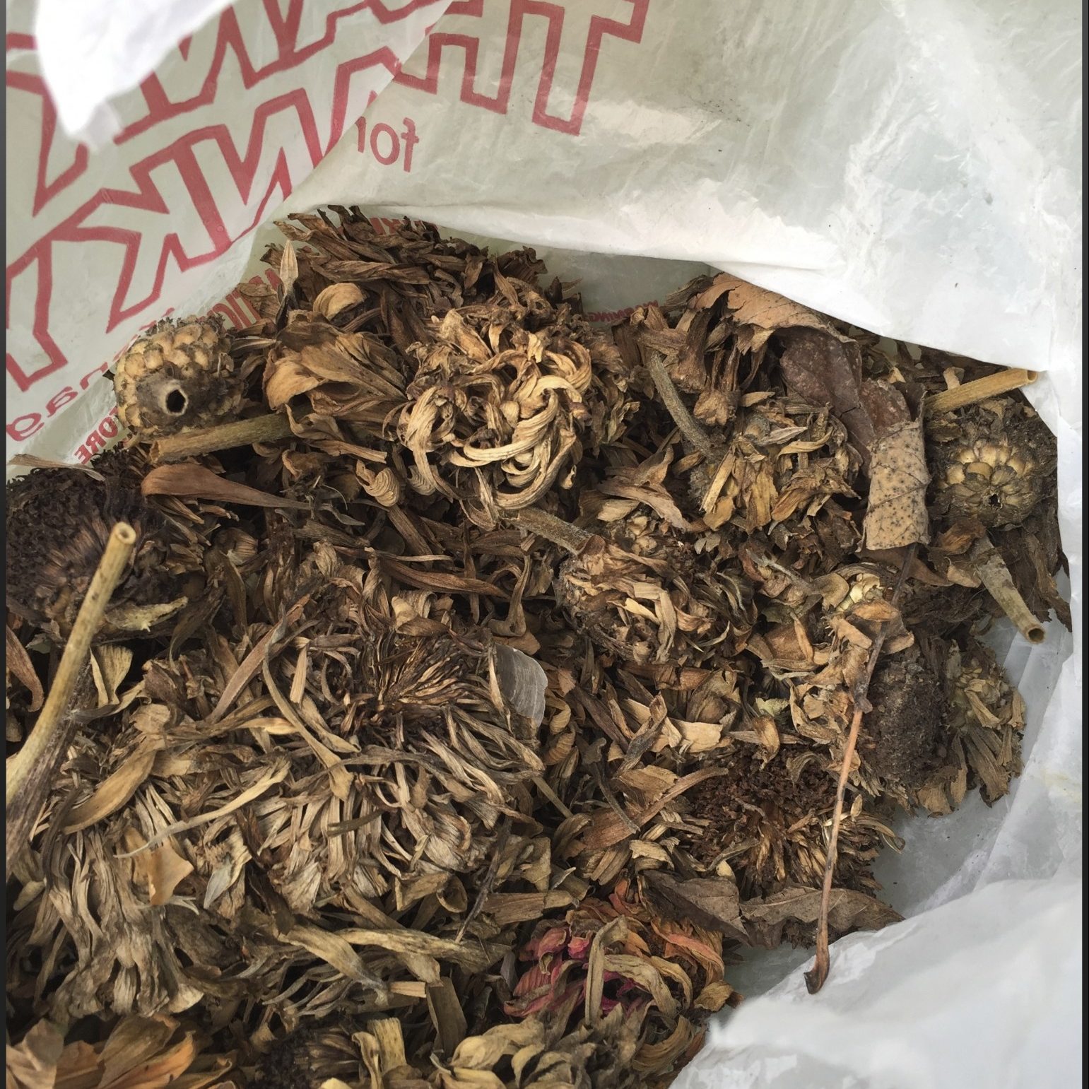 With a mixture of seeds and fluff/seeds I am ready to put on my Mother Nature hat and spread the seeds in the field and roadside areas on our property and then wait.