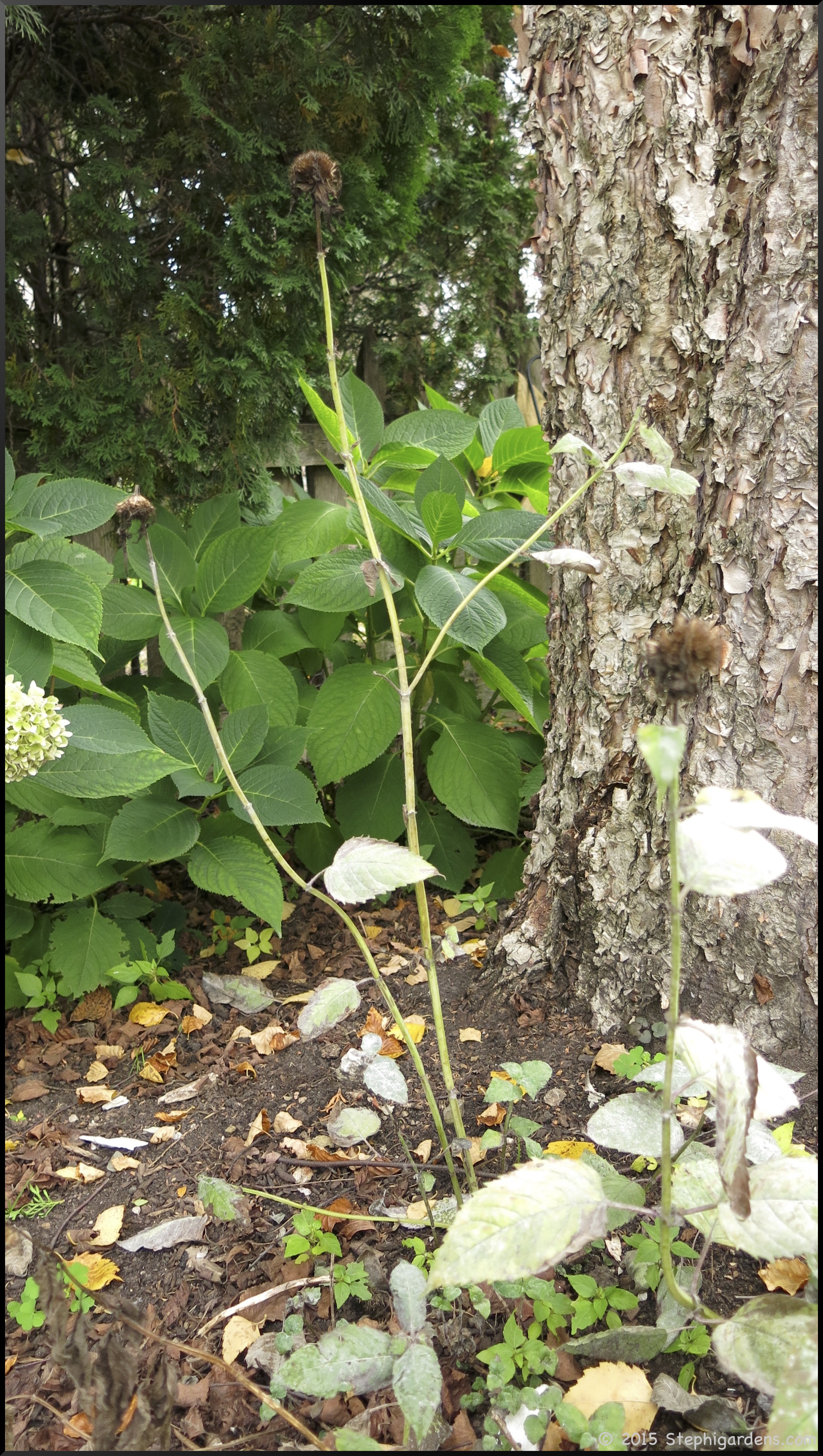 For many years I just ignored the Bee Balm since it didn’t really bother me; it was just another scraggly plant that bloomed well enough. It did tend to get powdery mildew which was unsightly and probably unhealthy for it. (But, looking at the pictures, it really should have bothered me long before it did.)
