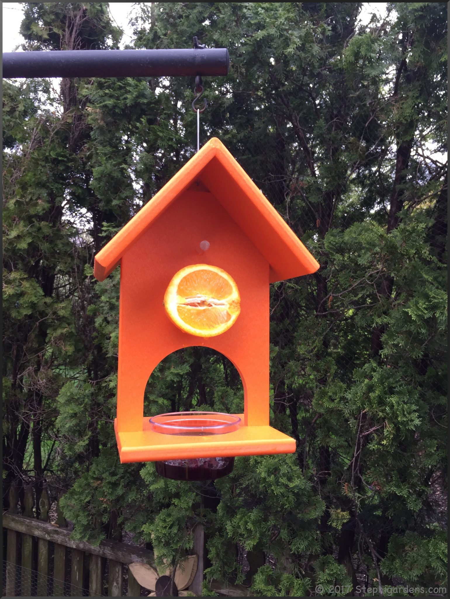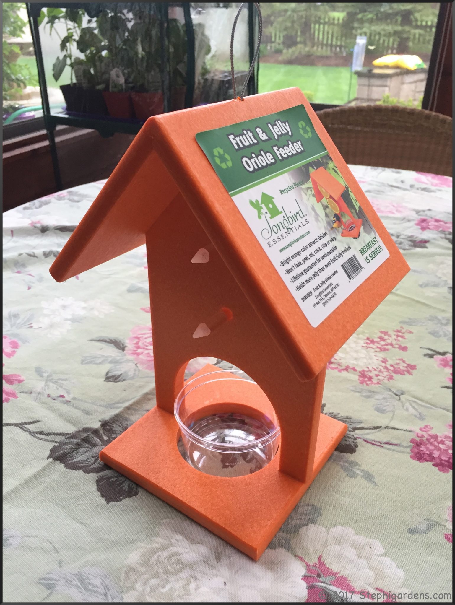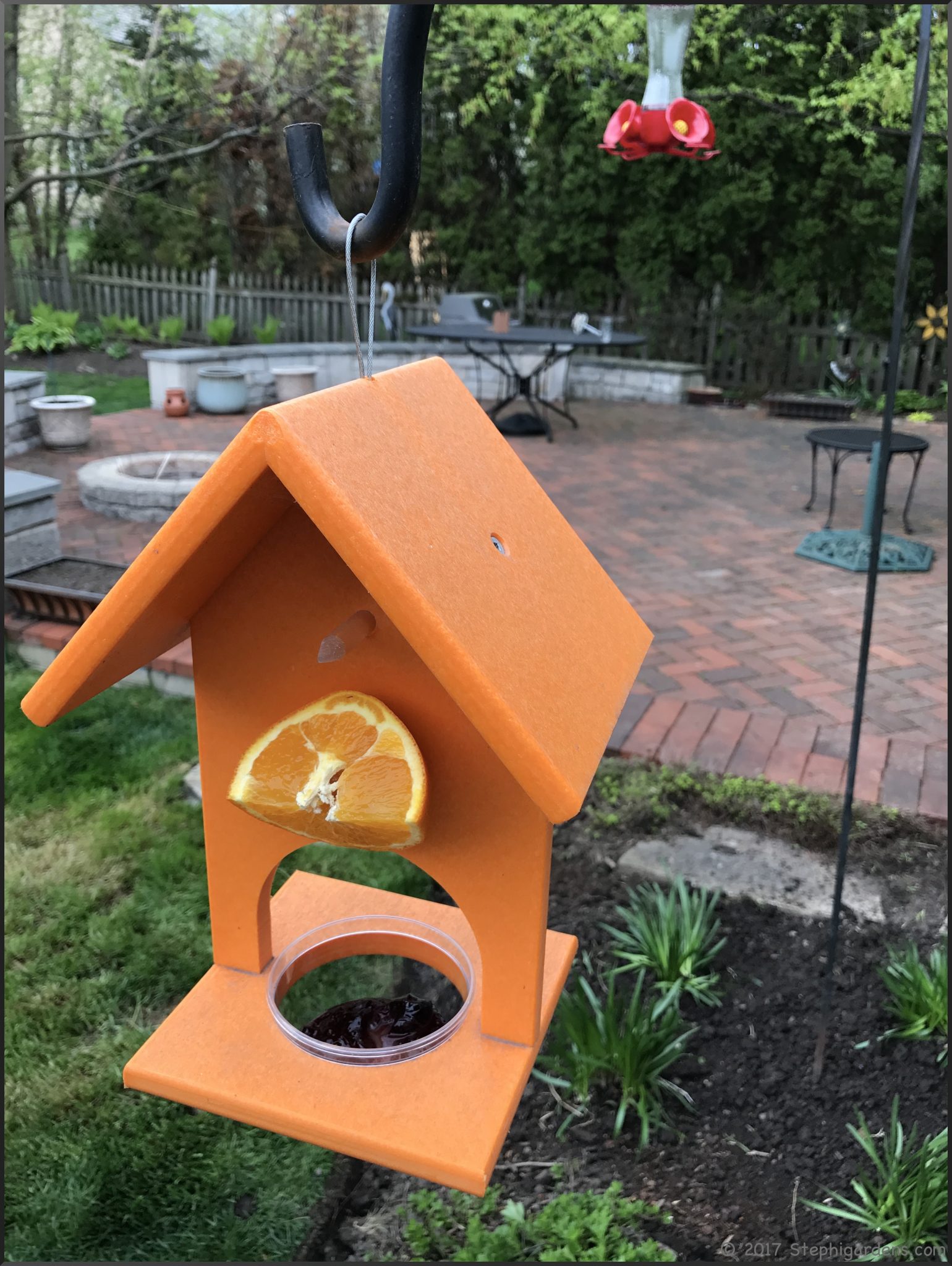 This year I hung it by itself and more out in the open by the hummingbird feeder. Orioles are attracted to orange and this time of year they love nectar, grape jelly and oranges. Later in the summer, they need more protein and you can switch to mealworms.