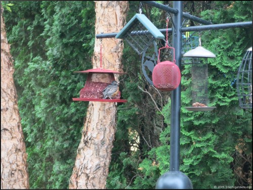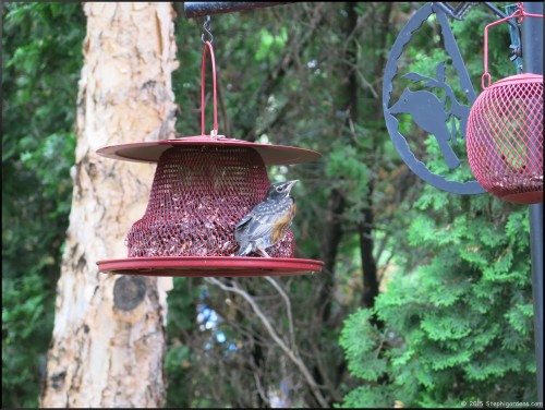 Upon closer look, it was a fledgling robin. Obviously, robins don’t eat from feeders, or eat sunflower seeds, so the little guy got a little confused and landed on the closest thing he could.