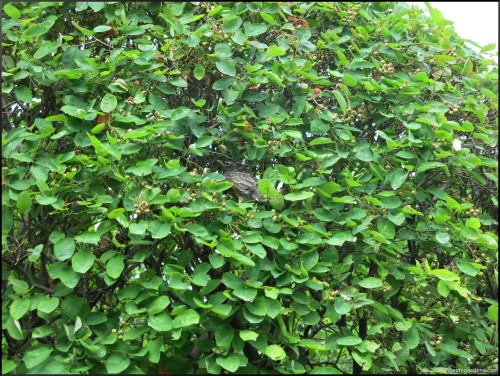 Definitely not where he wanted to be, so off he jumped/flew again. This time landing in one of the clematis about 10 feet away. Again, not a great place but at least less precarious.