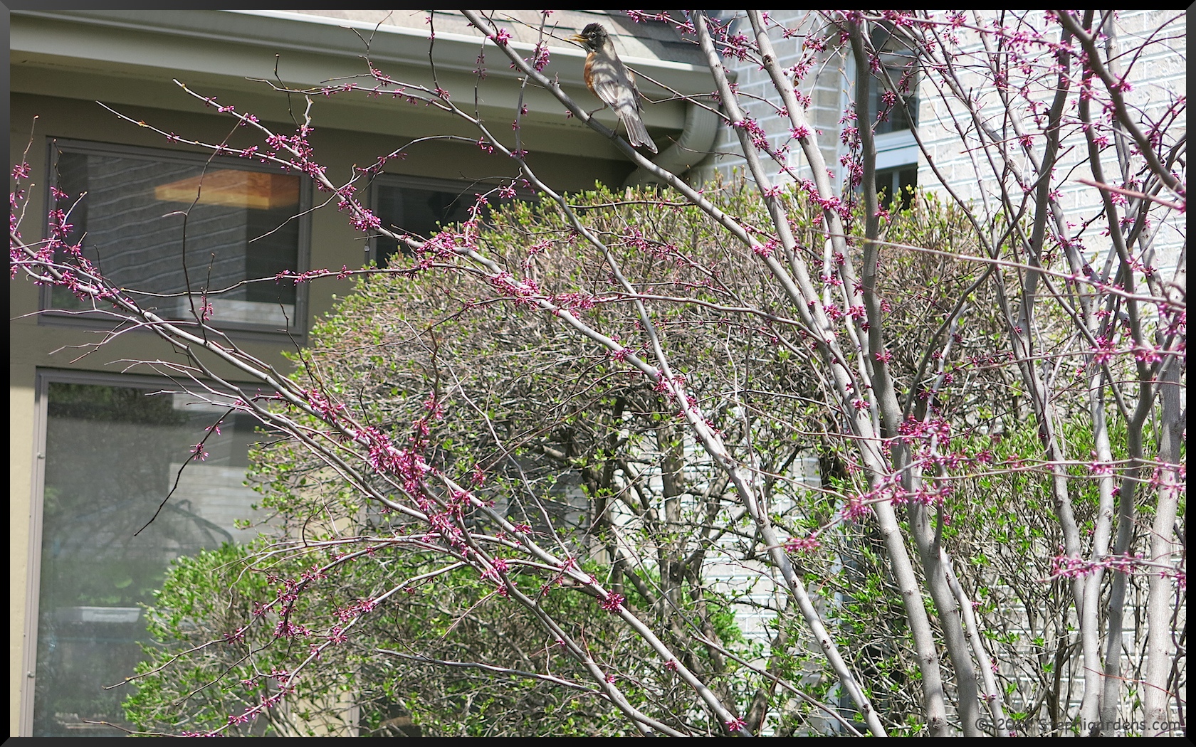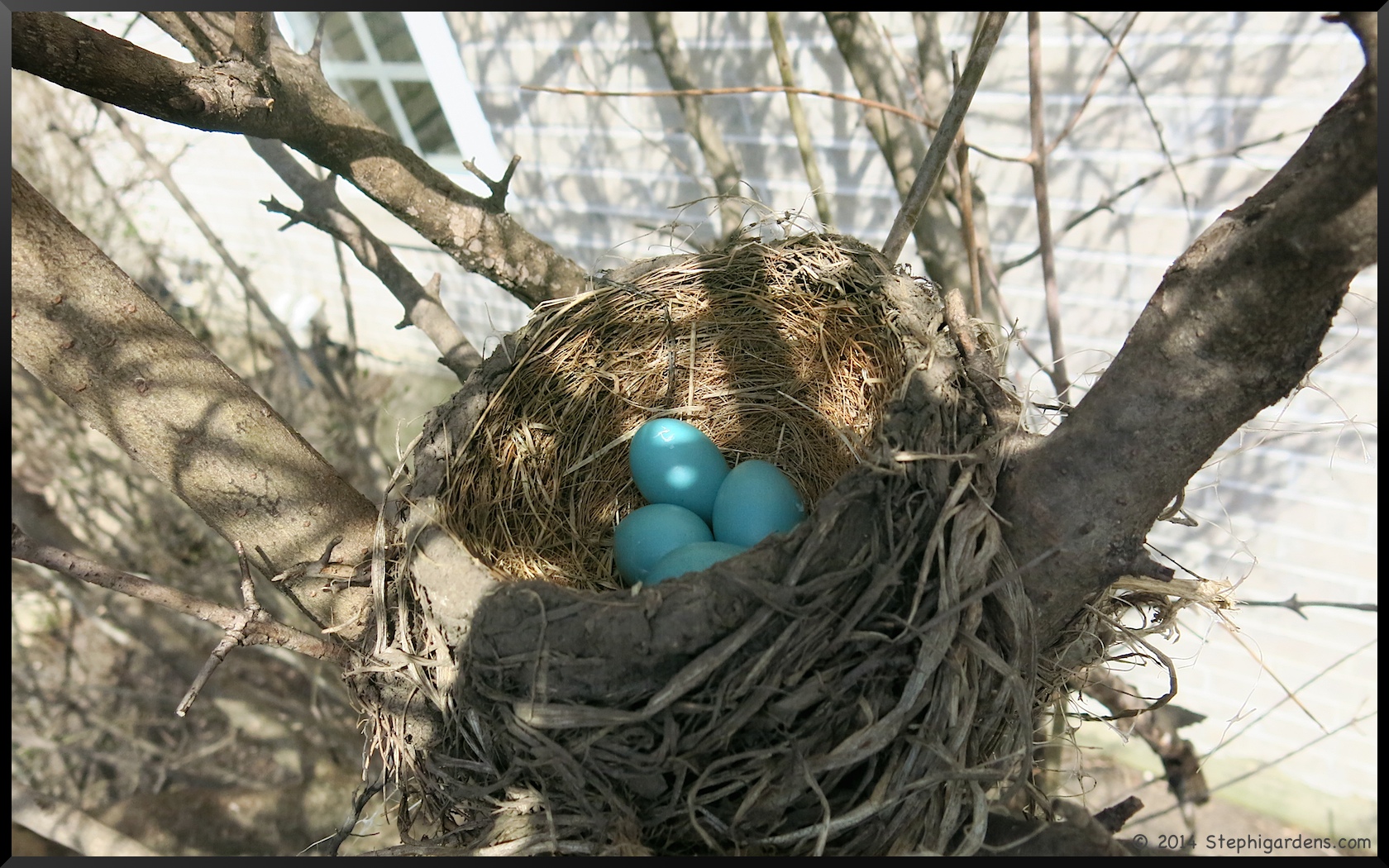 Then just recently a Robin has set up house under the elevated back deck. I discovered it first by walking out on the deck and scaring her off the nest right below my feet. Scared me too!