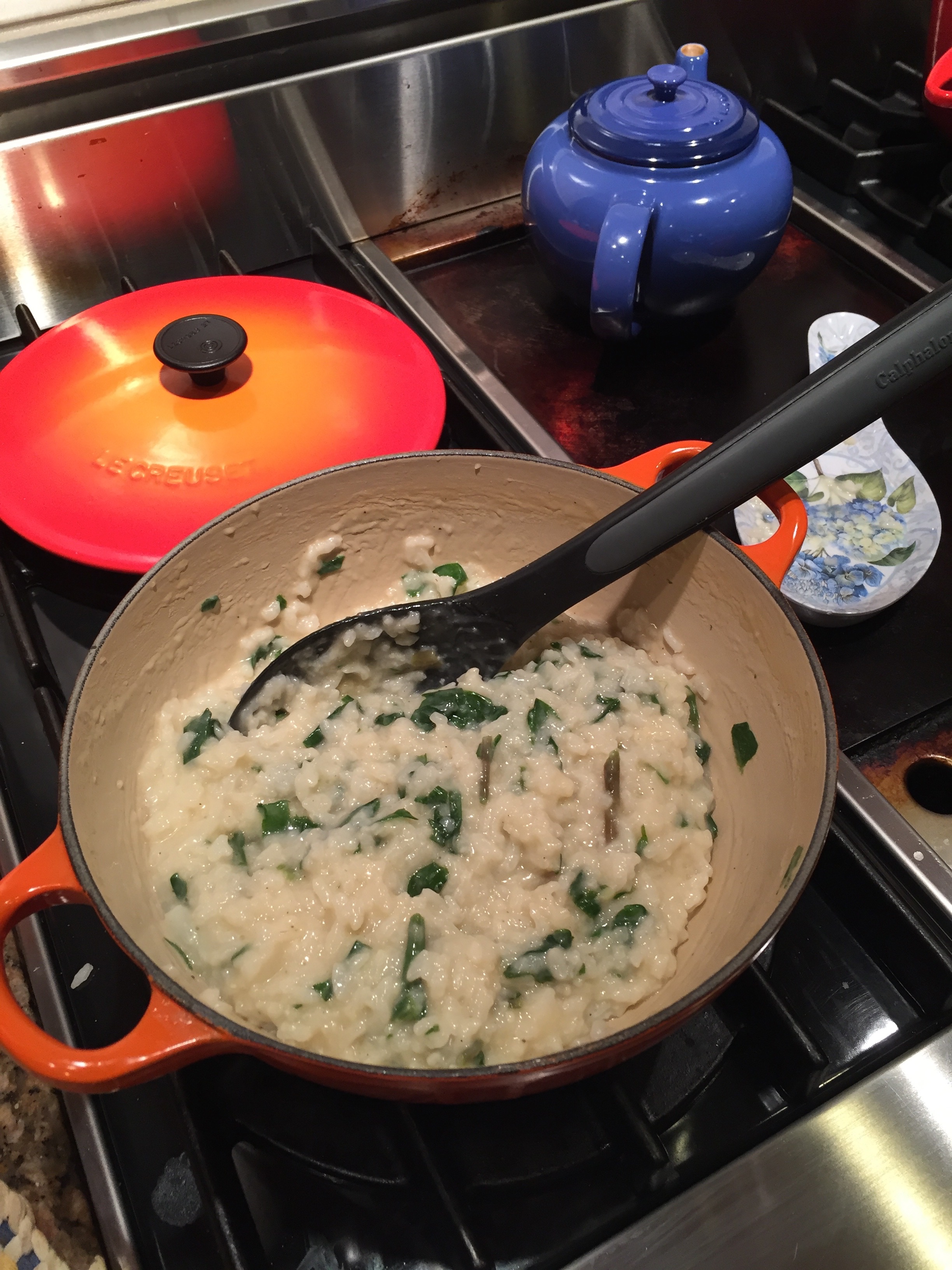 One of my first pieces of Le Creuset enameled cast iron cookware was a 3.5 quart Chef’s Oven in flame. I love this pan for sauces, soups, risotto, sautéing, pretty much anything. I thought it such a perfect pan I got one for my daughter when she moved into her own apartment. It is on the smallish side but there are larger versions available (and other colors).
