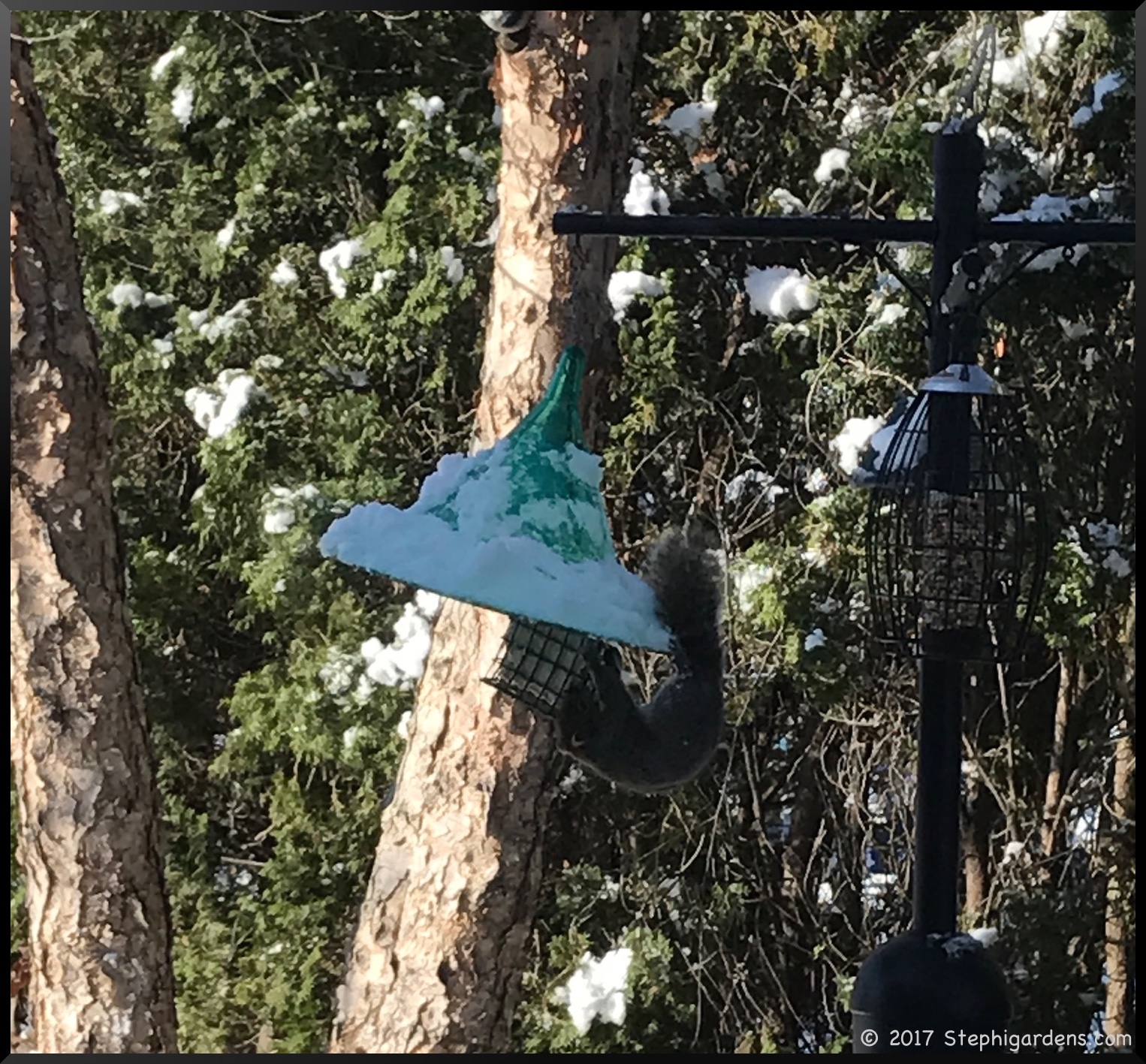 I’ve had an ongoing issue with squirrels ravaging my bird feeders. I bought a great Squirrel Stopper pole, but because I wanted to see the birds from my kitchen window, and despite clear instructions not too, I placed it too close to a nearby tree and arborvitaes. So, those very acrobatic squirrels have had fun feasting at my feeders!