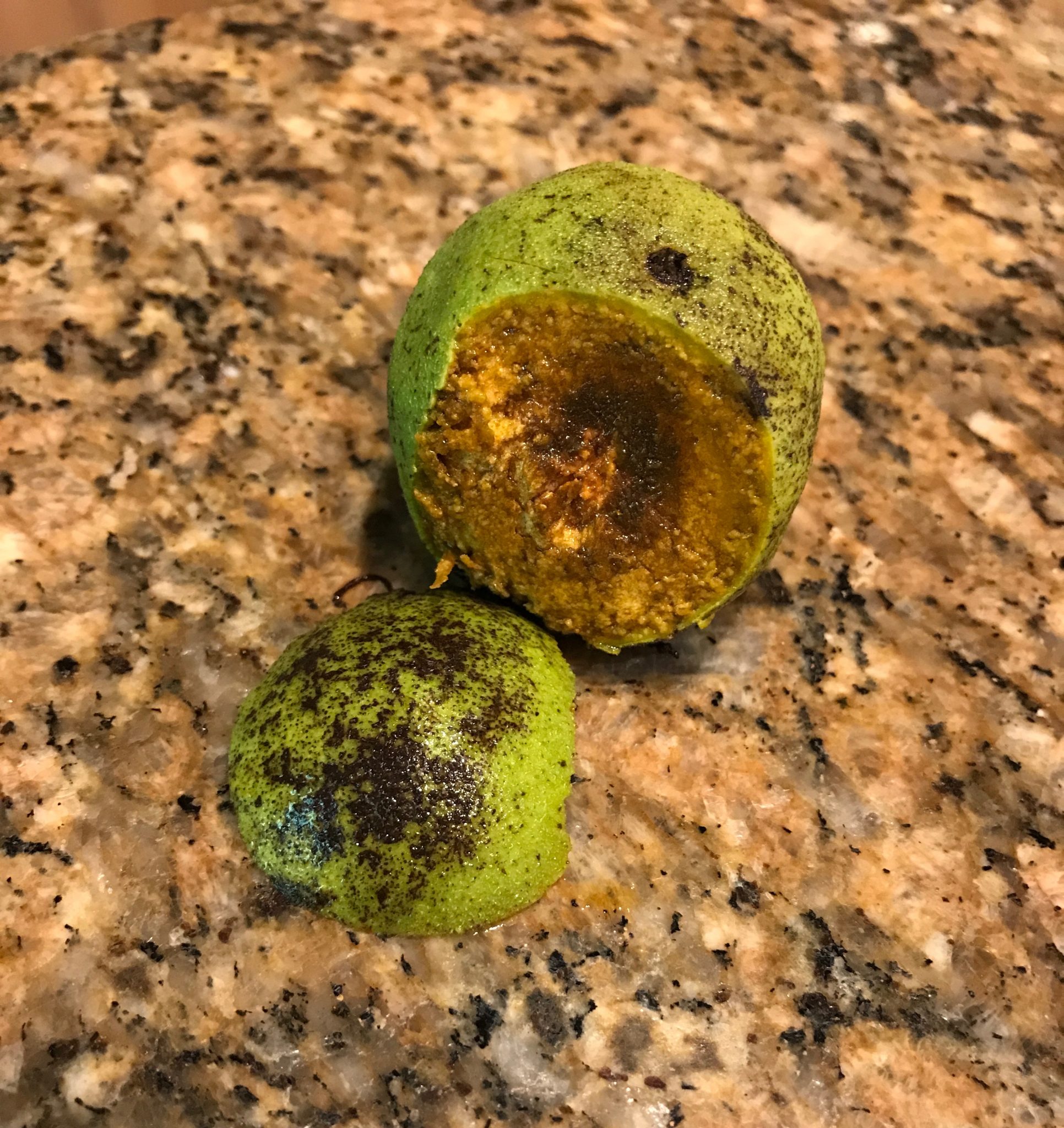 Cutting it open showed me it wasn’t a lime, butt instead a black walnut. Hmm… So I changed my question to why was there a black walnut in the planter on my front stoop. My best guess is a very creative squirrel. All over my yard I have signs of squirrel activity as they get ready for winter.