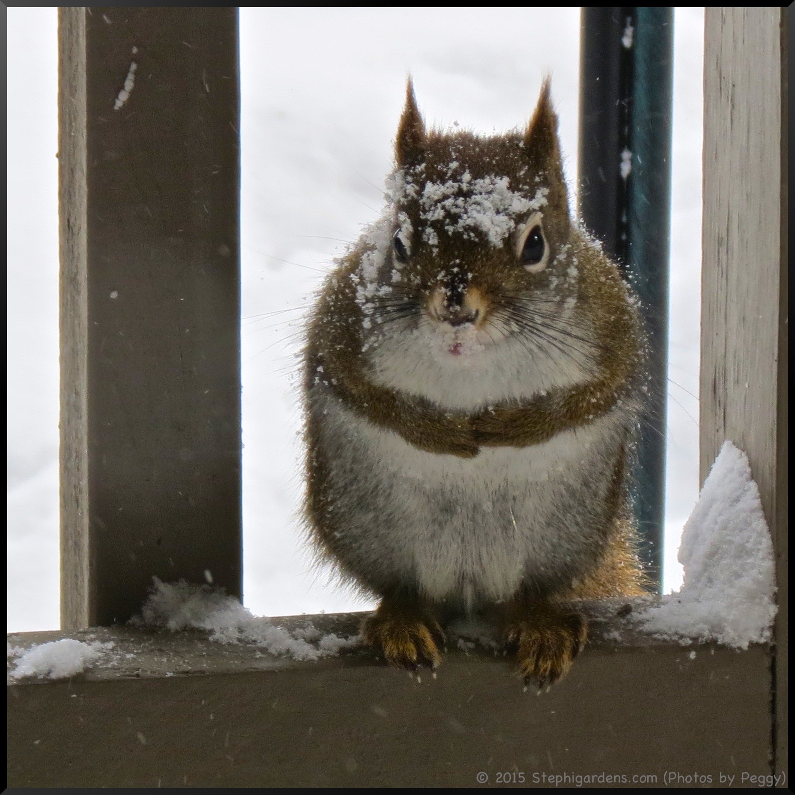 My mom made use of a recent blizzardy day, where she couldn’t even see the neighbors house, to takes some photos of the feathered and furry friends who are thankful for her food.
